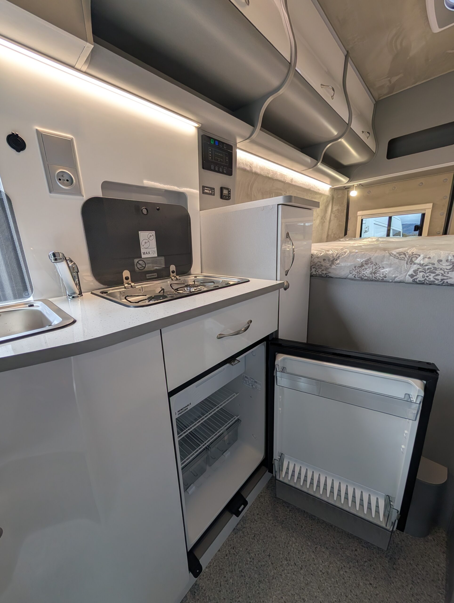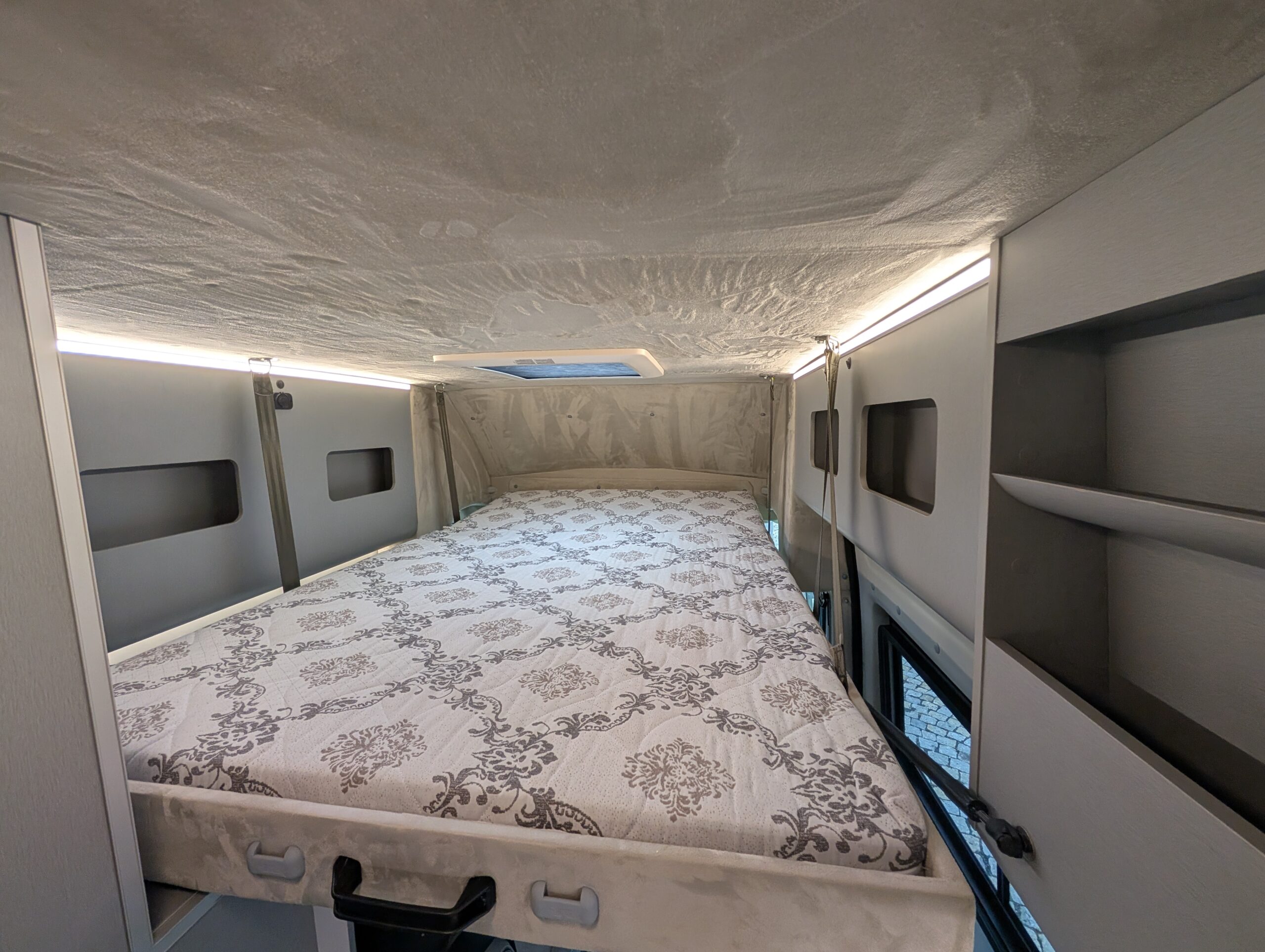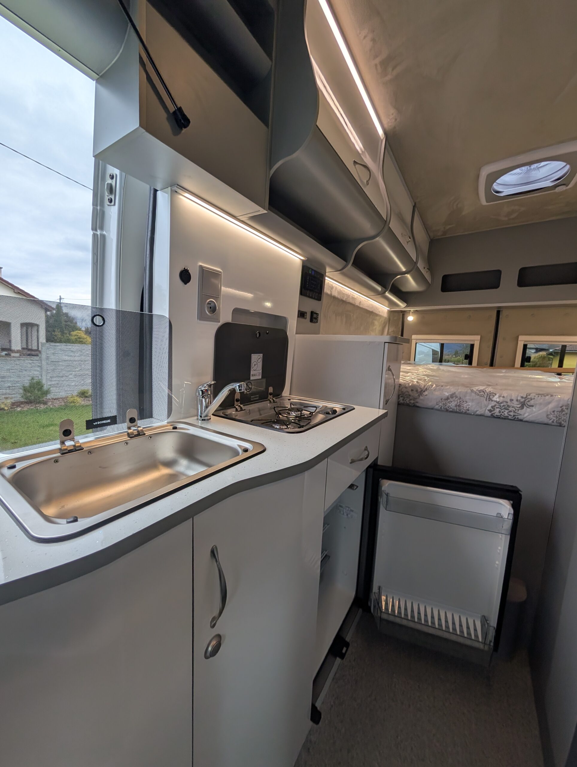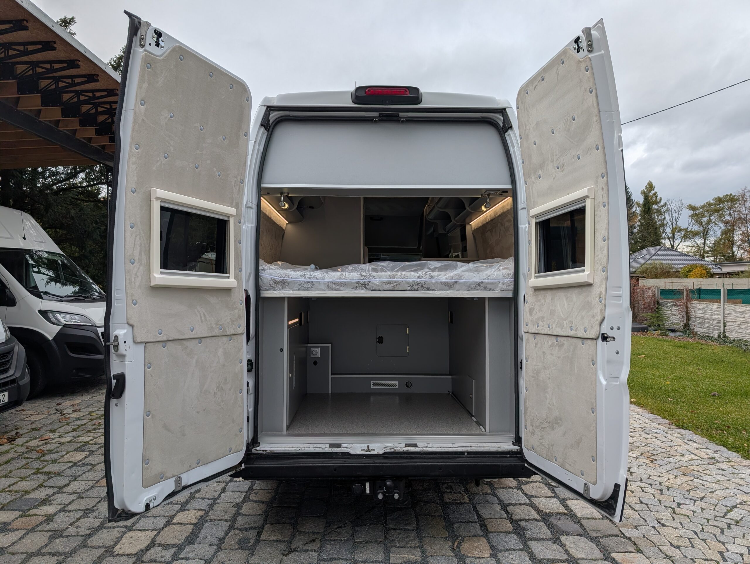 Výbava samotné vestavby: dvě samostatné posuvné a polohovatelné sedačky v druhé řadě s ISOFIXem, lednice kompresorová 80litrů, nádrže čistá voda 100 litrů, odpadní 70 litrů, chemické WC, umyvadlo, sprcha, dvouplotýnkový vařič na plyn, kuchyňský dřez, trakčí gelová baterie 100Ah, solární panely dvakrát 120w, LED osvětlení, nezávislé naftové topení 4kW s kombinovaným boilerem 9l pro ohřev teplé vody, venkovní světlo, markýza Fiamma 4m, velký úložný prostor pro 4 jízdní kola!